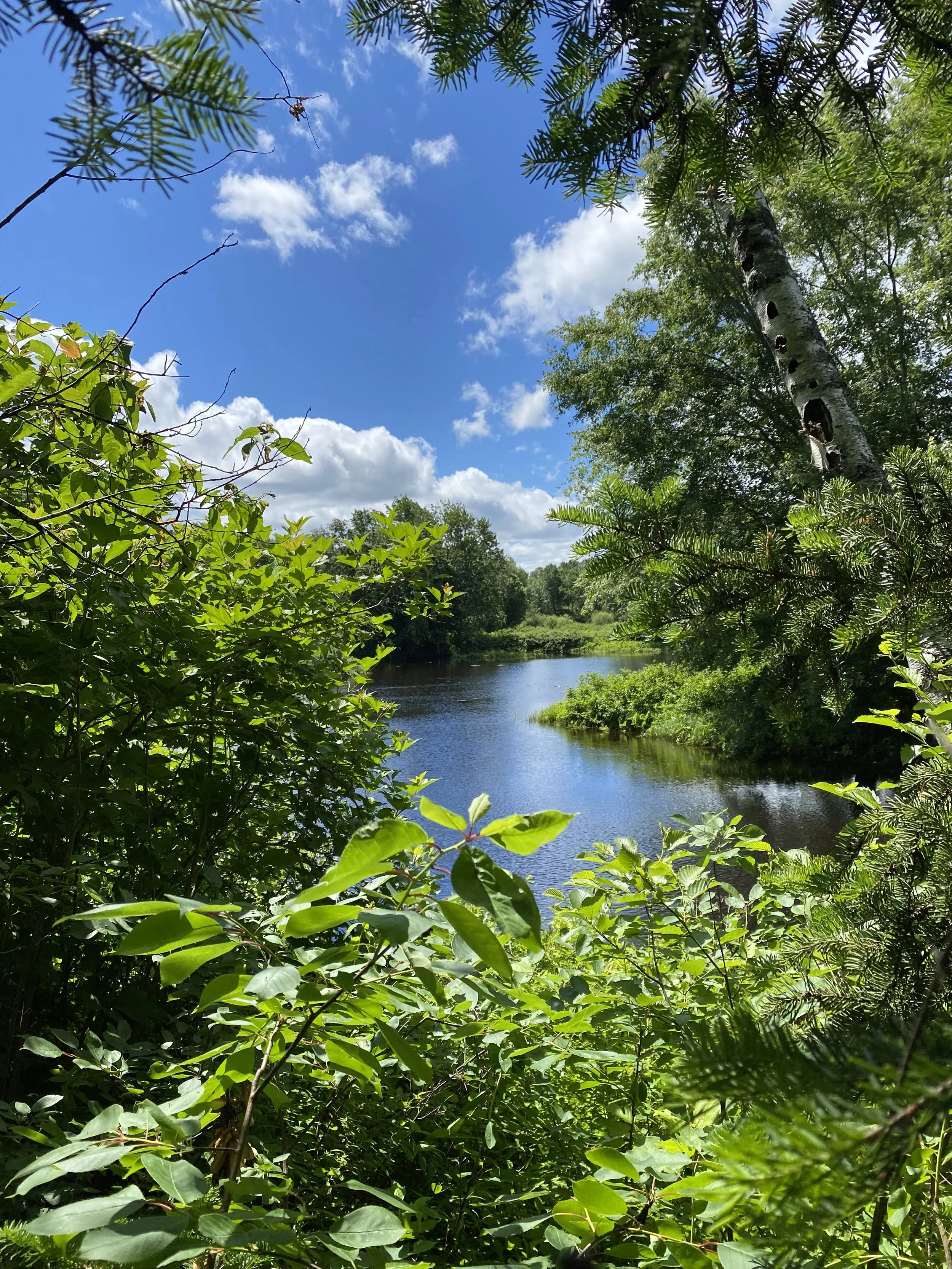 The quiet creek flows from the Wolastoq/Saint John River, pooling and branching through the area's ecologically significant habitats. As we walk to the corner of the adjacent hay field and push through the brush, John shows us where the shoreline is gently valleyed, shaped by last year's flood. With pride, he tells us of the history of the land and how it has flourished, untouched and tucked away in the Fredericton area. "It's a special place," he says.